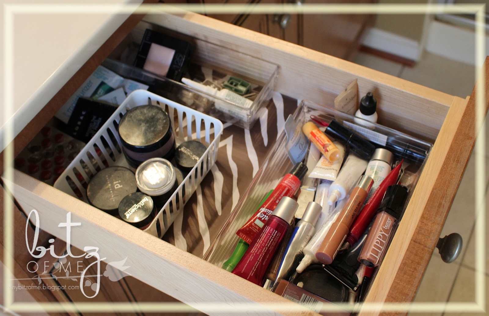 I also lined both of my vanity drawers with my zebra contact paper. This drawer holds extra makeup, makeup samples I'm trying out and my collection of lip balms and glosses. I cannot stand dry hands or lips...hence my love for all my many lotions and balms. So this clear organizer holds all kinds of lip glosses and balms that I can grab quickly when I'm in the bathroom....also all my eye creams are in here. I'm slightly obsessive about wrinkles around my eyes...so anytime I'm in the bathroom I grab an eye cream and dot it around my eyes...probably 3 times a day. Yeah I know...but I have such dry skin and its like my body never has enough moisture...so eye creams, lotions and lip balms are my saviors especially in the wintertime :)